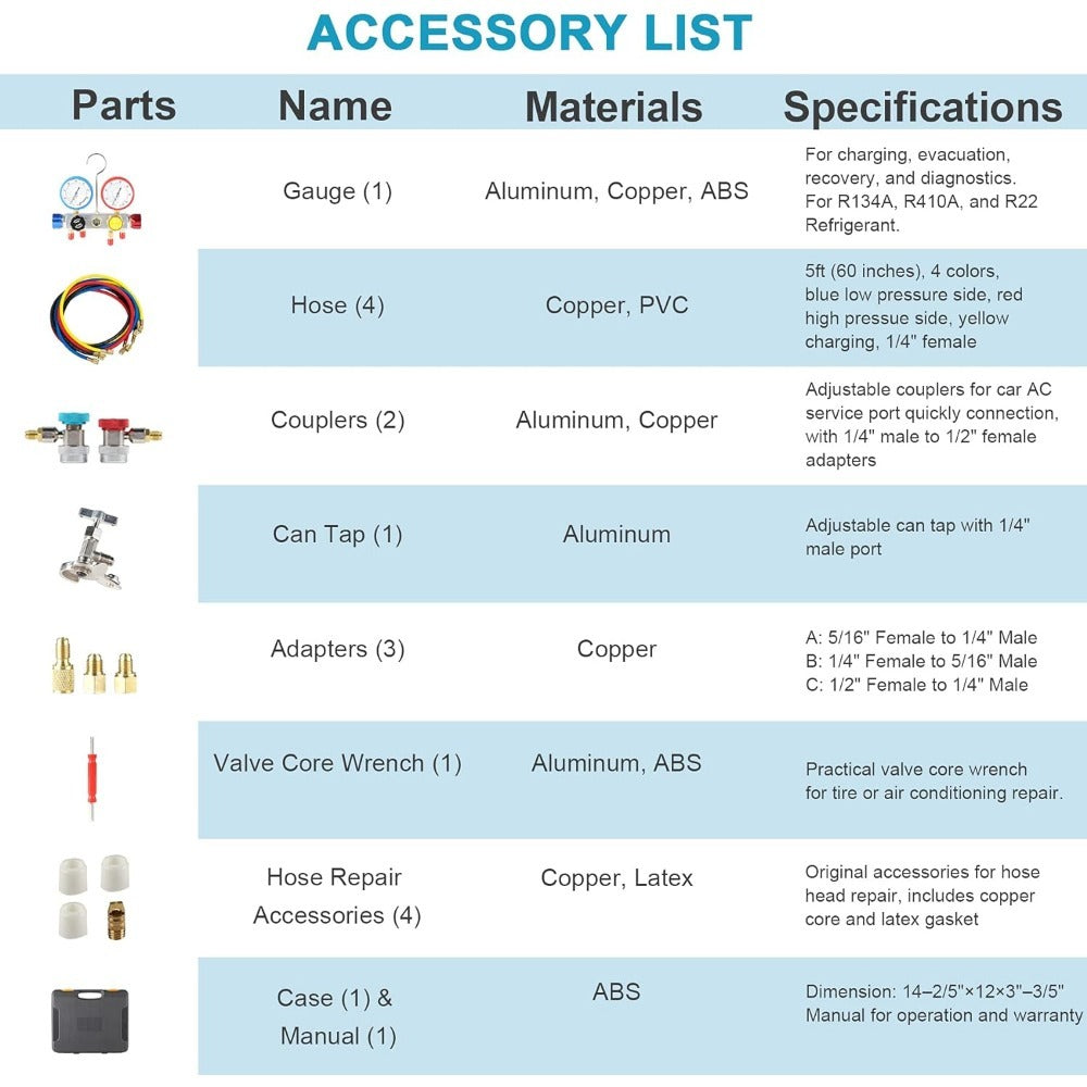 KOMPLETTES MESSGERÄT-SET: Dieses professionelle Kfz-Klimaanlagen-Werkzeugset enthält ein 4-Wege-Messgerät, 4 farbcodierte Schläuche, 2 einstellbare 1/4-Zoll-Schnellkupplungen, einen 1/2-Zoll-auf-1/4-Zoll-Acme-Adapter, einen 1/4-Zoll-auf-5/16-Zoll-Adapter, einen 5/16-Zoll-auf-1/4-Zoll-Adapter und einen Dosenhahn zum Einstechen. Genießen Sie die problemlose Einrichtung und einfache Bedienung, während Sie Ihre HVAC-Probleme im Keim ersticken.